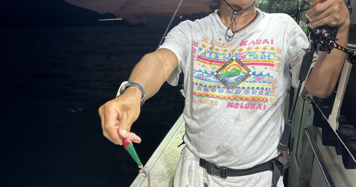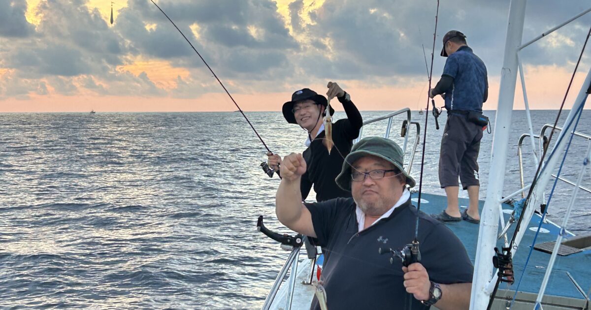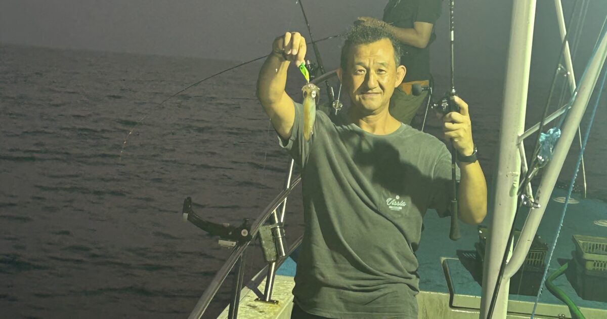 お盆休み明け、久しぶりの出船です👌 僚船情報では深めの水深で、好釣との情報もらい東に走らせました🛥️ 潮は逆潮に少し流れましたが、水深60mでもアンカーでやれました🙆♂️ 明るい時間は…一杯⁇ 点灯してポロっ⁈ 不安し…