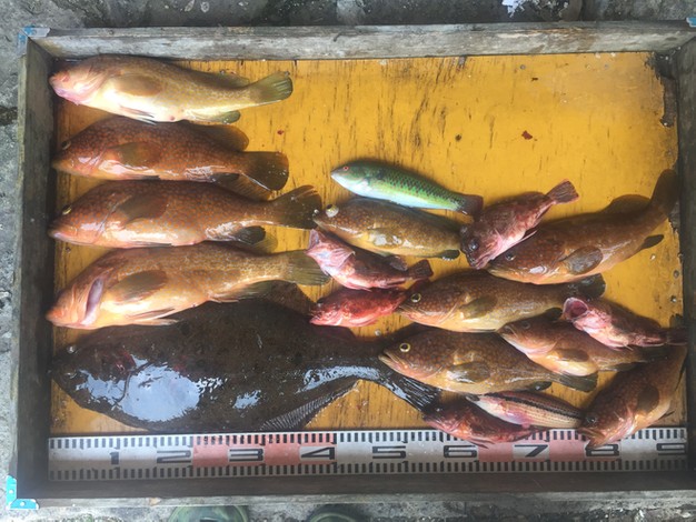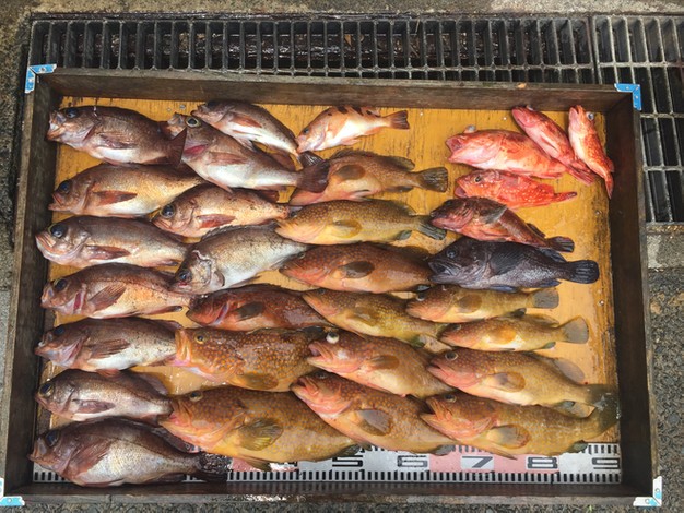 天候 くもり一時雨 風向 南西 波高 凪 潮 速い 渡船の合間に、船からアジ呑ませ釣りです(^^)/ 上潮が速い上に、西寄りの風で、流しにくかったです(^_^;) お二人で昼までに、メバル11匹、アコウ13匹、写真…