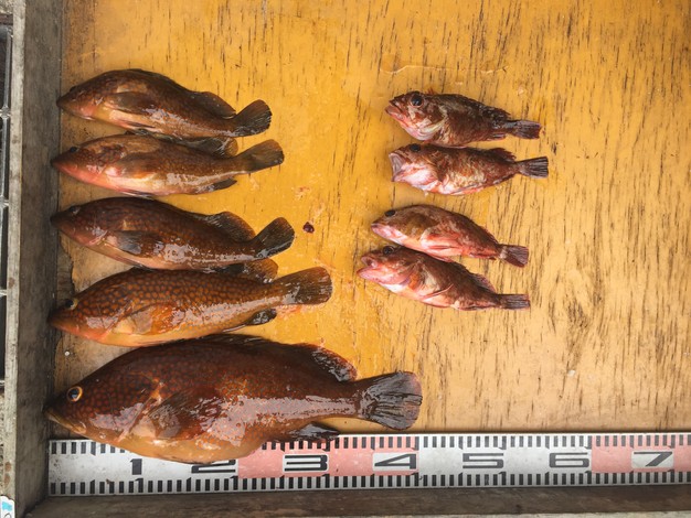 天候 くもり一時雨 風向 南 波高 凪 潮 速い 土曜日ですが、雨予報で、お客さん少なかったです(T_T) ロックフィッシュで良型のアコウが釣れました(^^)/ 白子島 森元さん2名様 ふかせで30cmまでのグレ…