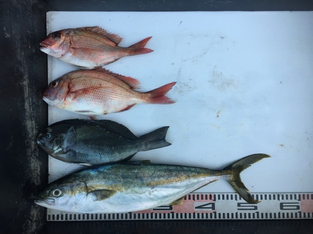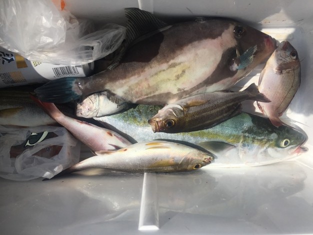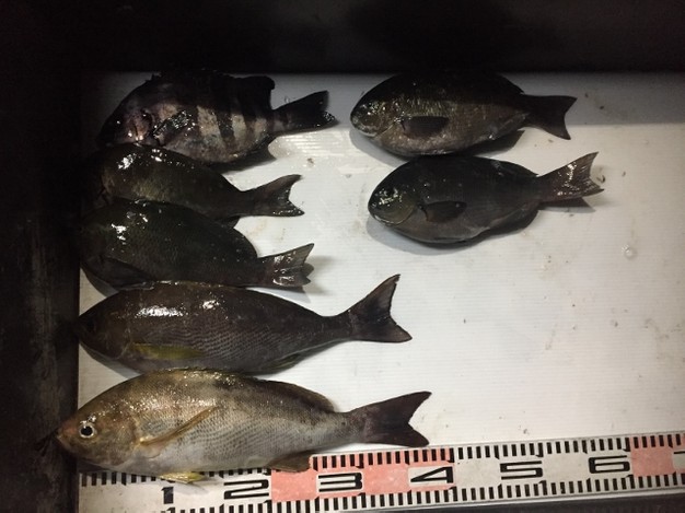 天気 晴れ 風向 東~南 波高 凪ぎ 潮 緩い~速い 通し釣り釣果です(^^)/渡ってすぐにコマサ(^^♪明るい内は、グレが釣れました(*^^)v (もう一回り小さかったのでリリース5,6枚) ノコギリ 福永さん…