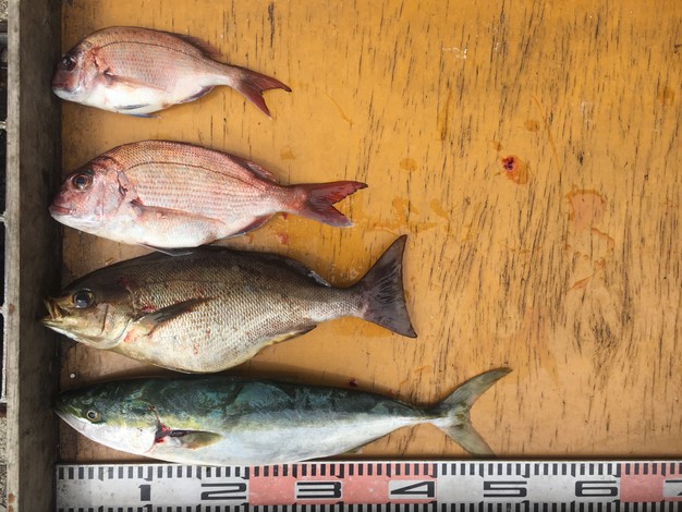 天候 晴れ 風向 東~南 波高 0.5m 潮 上り 水温 18.5℃ 半夜釣り釣果です☆ カゴで2投目にイサキ(^^)v夕間詰にマダイが釣れました(^^)/ 茶釜 ホリさん マダイ35cmまで(^^)/ ふかせで…