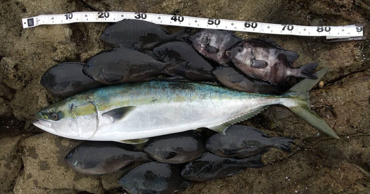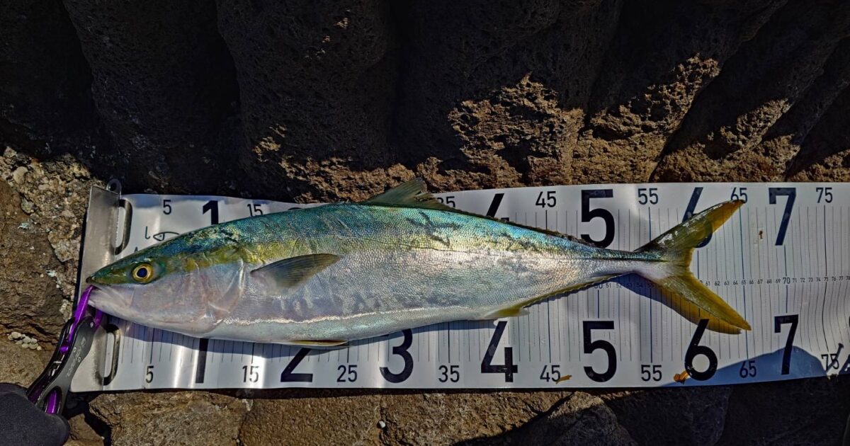 天気晴れ 風向風弱く 波高凪 潮上り 水温14.5℃ いい凪になりました🙆♂️ つるぺたで凪すぎなくらい😅 沖の潮は速かったですが、磯回りはそうでも無かったようです… 今日は今季初のヒラマサGET〜😍 朝一にメジロも釣…