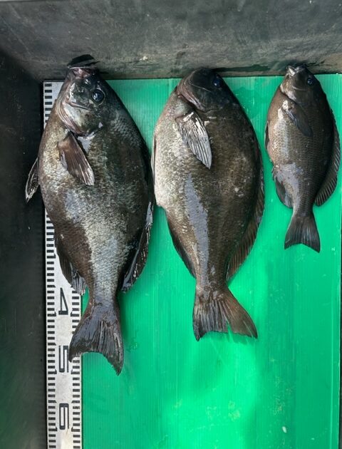 天気晴れ 風向風弱く 波高凪 潮緩い 水温17.5℃ 昨日のうねりがとれて、ツルペタの海でした😅 潮もほとんど動かない厳しい海でしたが、意外にも賑やかな釣果写真になりました🙆♂️ 茶釜 ふかせ グレ48cm 45cm😍…
