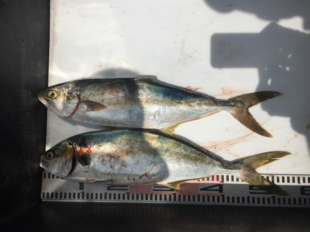 天気 くもり雨→晴れ 風向 北東 波高 0.6m 潮 上り 水温 27℃ 台風の影響で、長い休みになり、久し振りの出船でした(^^♪本潮に東風で、波がバサバサしましたが、それが良かったのか、、、 カゴ、ルアー共に…