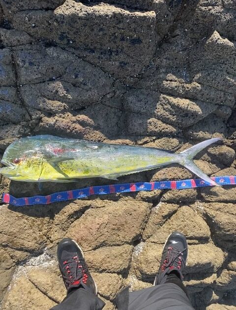 7月2日金曜日の磯釣り釣果です! 今日は、ルアーでBIGゲストが❗️ 西肩 ルアー シイラ102cm🐟 これ以外にも何度か同サイズのチェイスがありました😅 初のメモリアルフィッシュステッカー進呈! クエを釣られた西川さん…