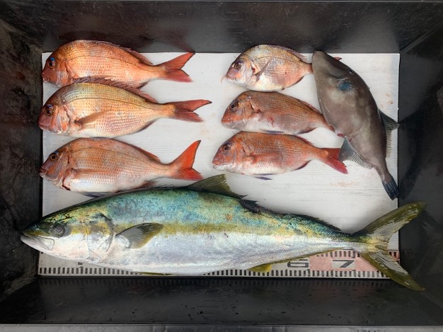 天気 晴れくもり 風向 東 波高 凪〜0.5m 潮 下り 朝イチは、いい凪でしたが、次第に東風が強くなり、バチャバチャしてましたσ(^_^;) 潮も風に負けて逆潮でしたが、今日は人数の割にグレが良く釣れてました!(…